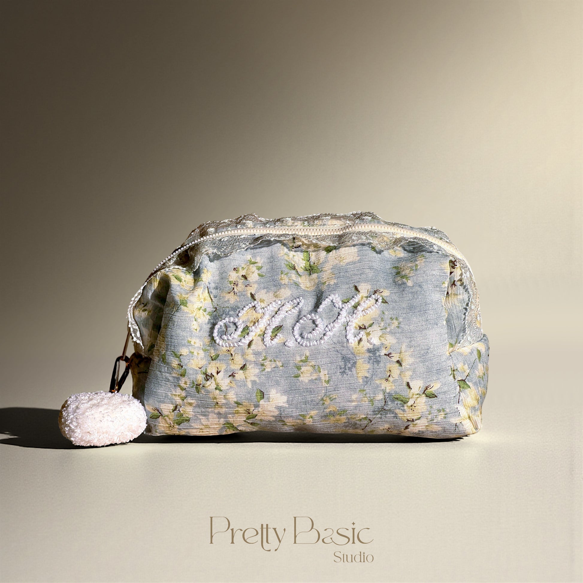 A dreamy floral pouch crafted in soft hues, featuring your initials tufted in an elegant script. Feminine, timeless, and perfect for makeup, travel, or gifting.