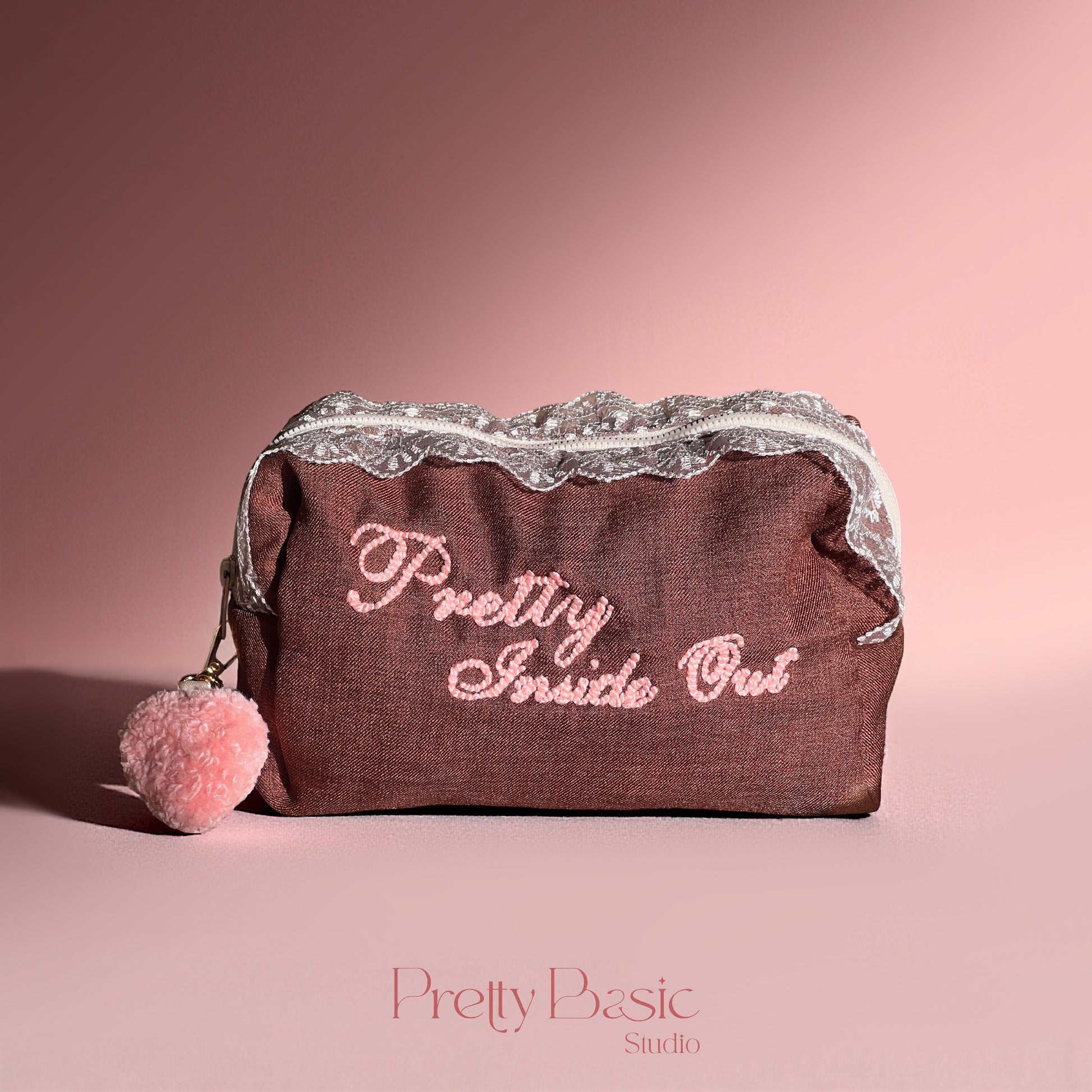 A warm rosebrown pouch tufted with Pretty Inside Out in blush pink — the perfect blend of charm and intention. A reminder that beauty begins within, crafted into your everyday essential.